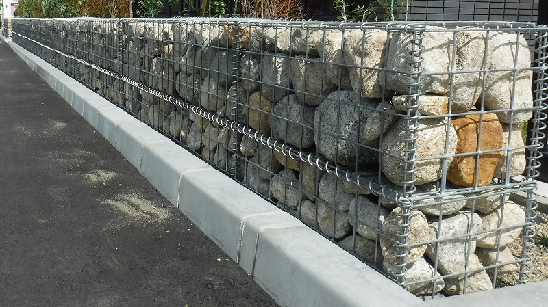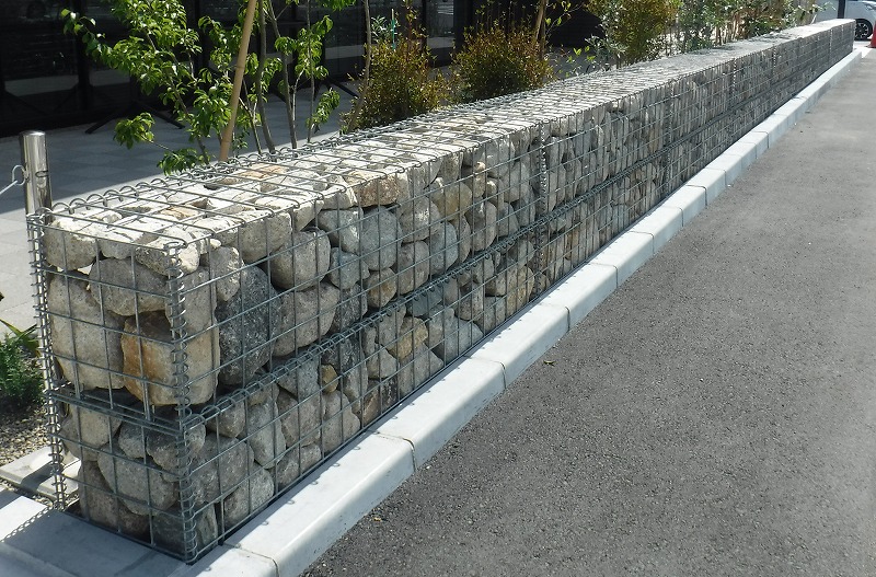 ご覧の通り「金網に石を詰めた」モノです。本来、河川また法面等に設置されている此の「じゃかご」ですが、ここでは、おしゃれな装飾としてデザインされています。