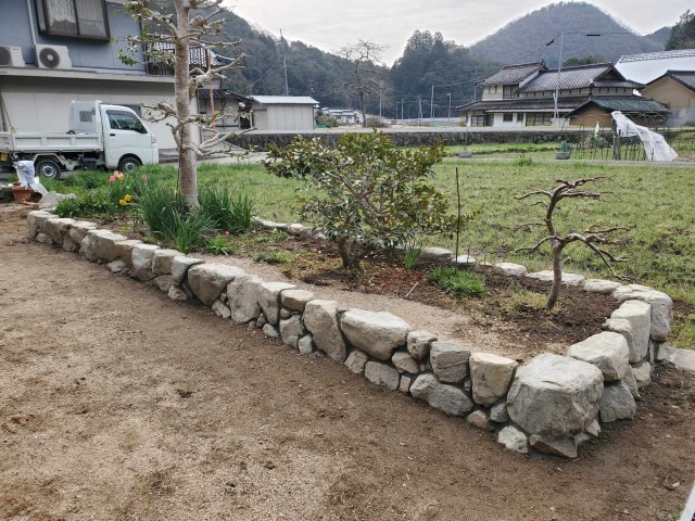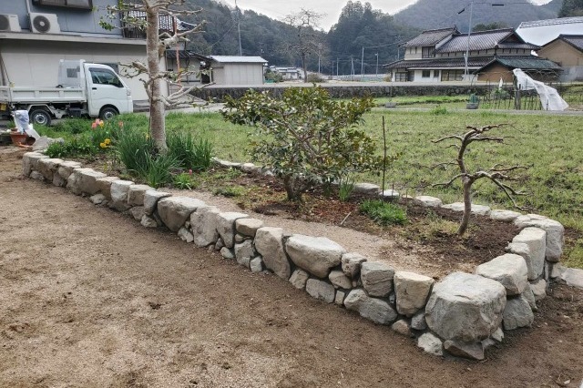 岡山県赤磐市のあるお宅。 お庭の植栽枡を「テストピース」と呼ばれるコンクリート製のモノで囲んでおりました。 自宅の改修に伴い発生した自然石を再利用しようと言う発想から今回、それらを入れ替えた形で植栽桝を造り直しました。